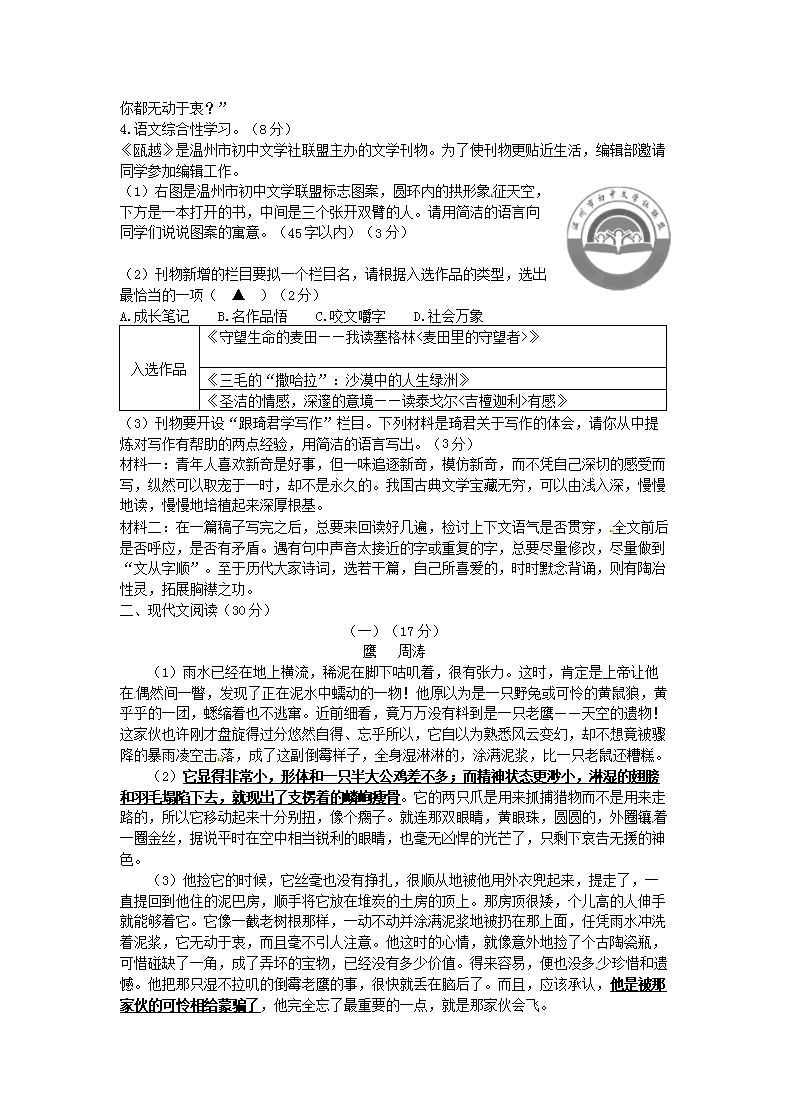【文档名称】 2013浙江省温州市中考语文真题及答案(Word版).doc
