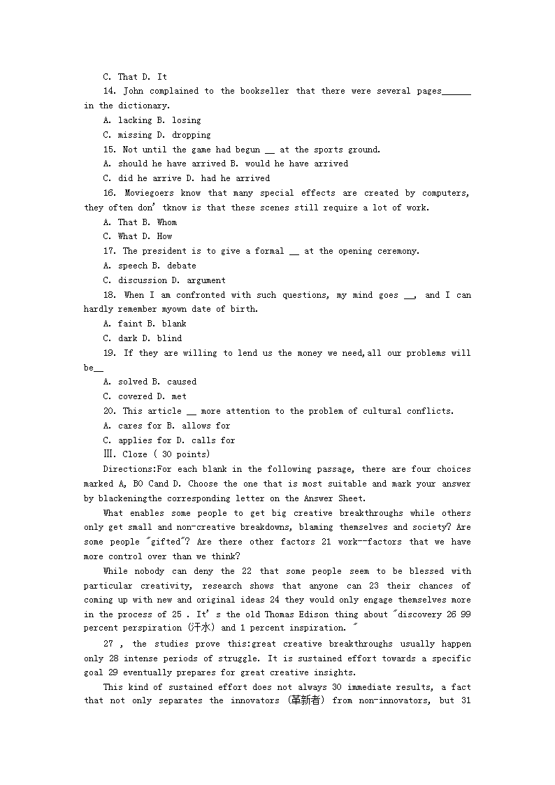 【文档预览】 无忧考网整理发布2017年甘肃成人高考专升本英语真题及答案(Word版),前五页预览如下: