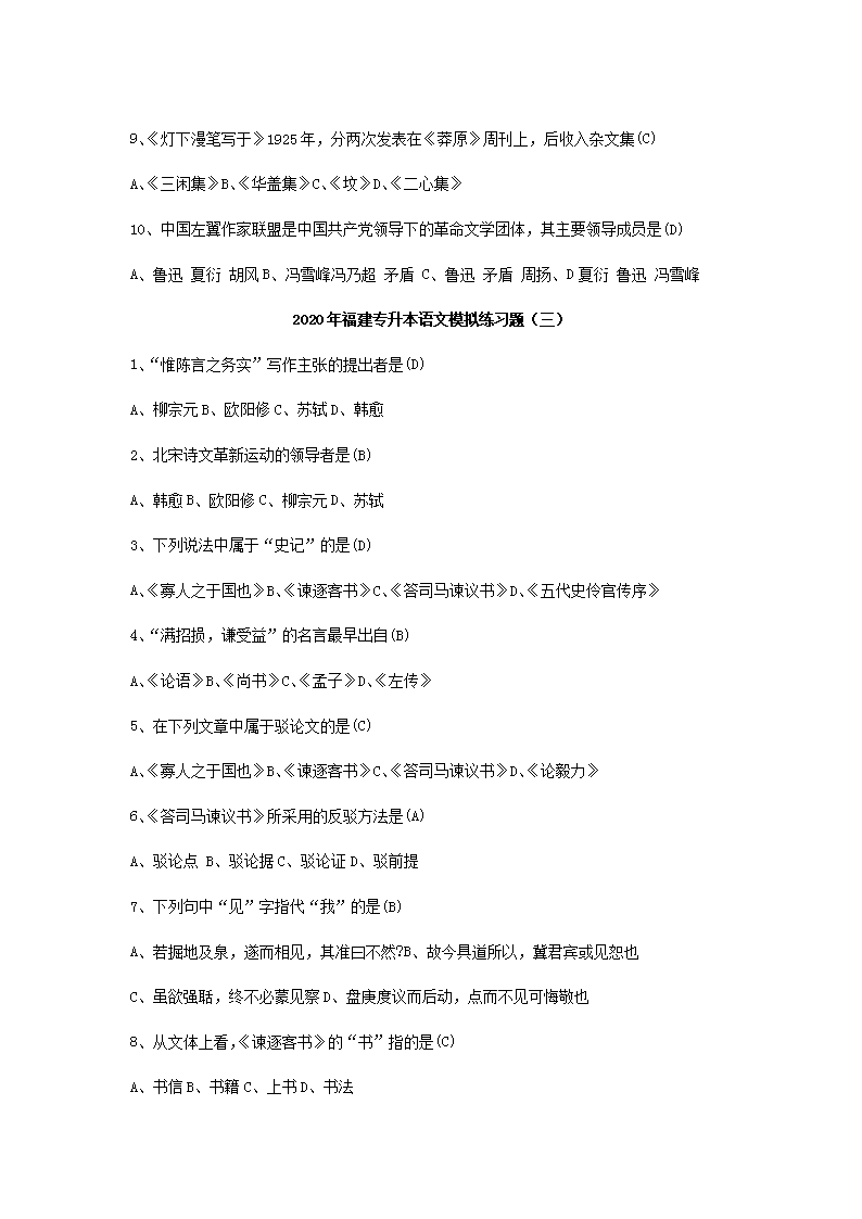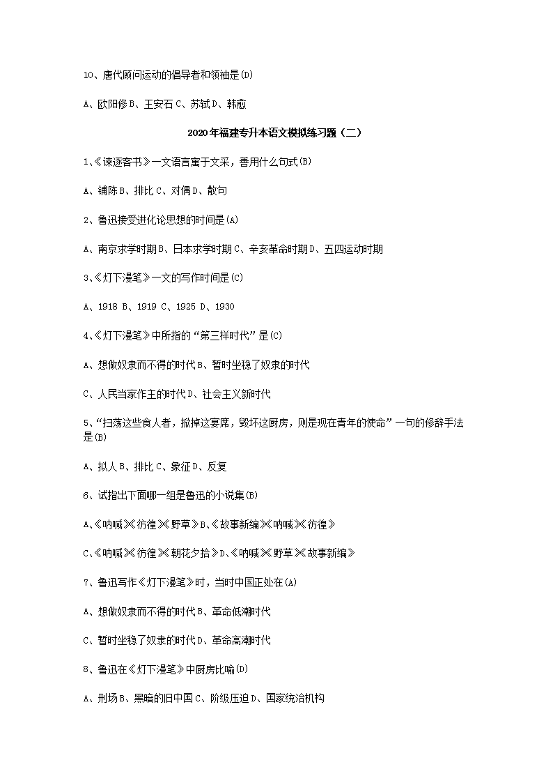 【文档名称】 2020年福建专升本语文模拟练习题四套(Word版).doc