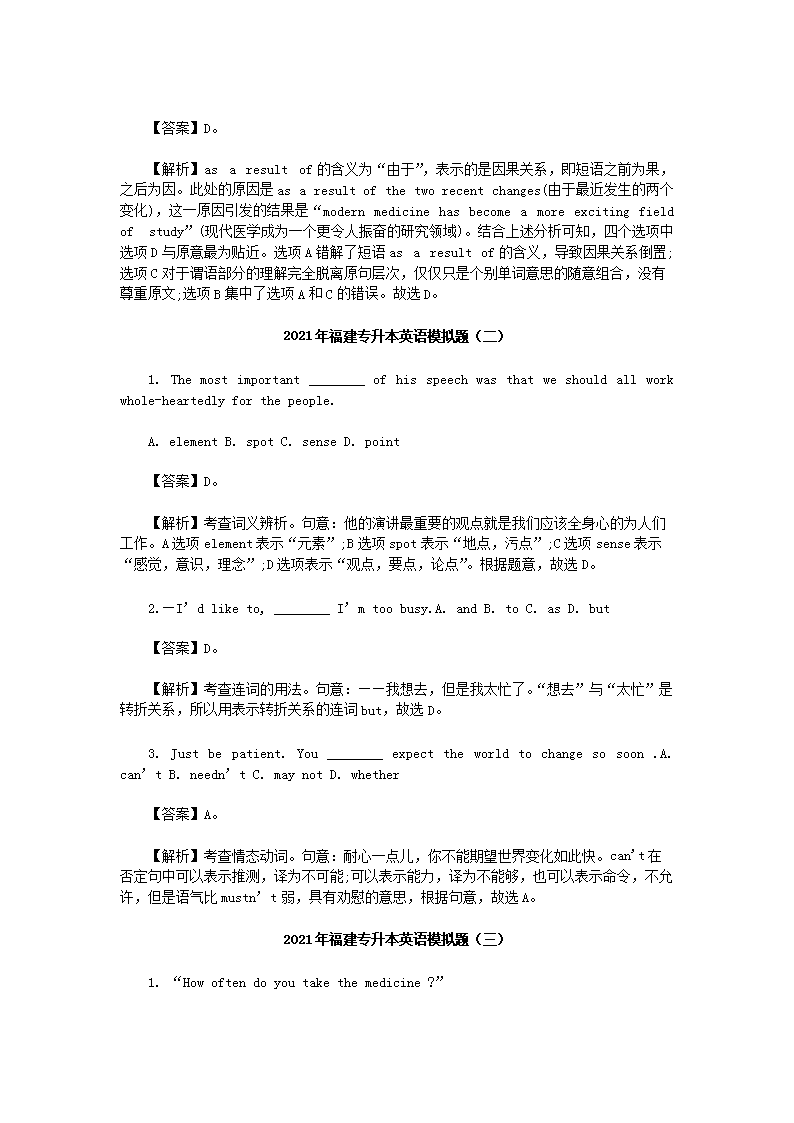 【文档预览】 无忧考网整理发布2021年福建专升本英语模拟题三套(Word版),前五页预览如下: