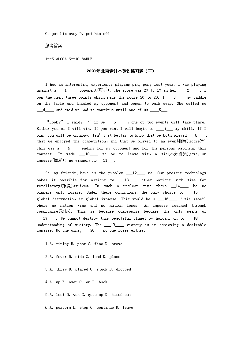 【文档预览】 无忧考网整理发布2020年北京专升本英语练习题三套(Word版),前五页预览如下:
