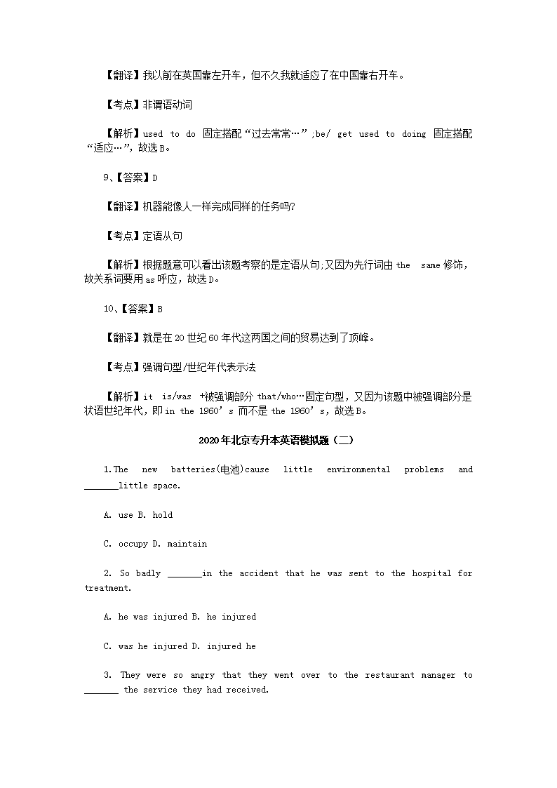 【文档预览】 无忧考网整理发布2020年北京专升本英语模拟题三套(Word版),前五页预览如下: