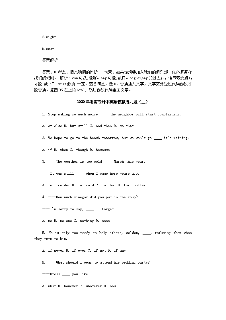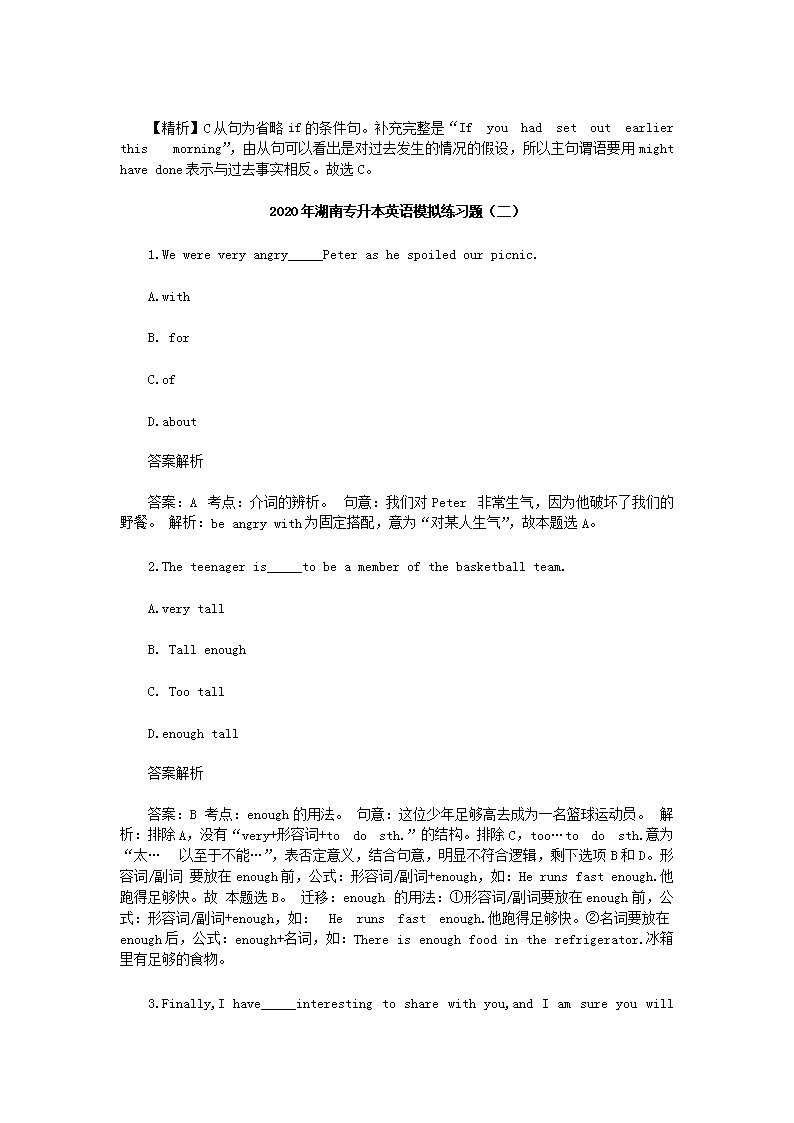 【文档预览】 无忧考网整理发布2020年湖南专升本英语模拟练习题三套(Word版),前五页预览如下: