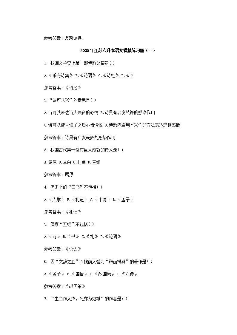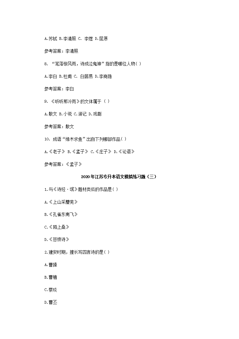 【文档名称】 2020年江苏专升本语文模拟练习题三套(Word版).doc