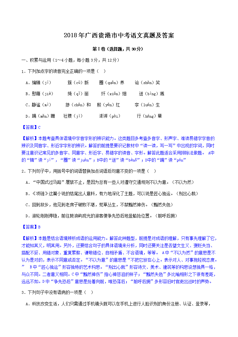 【文档名称】 2018年广西贵港市中考语文真题及答案(Word版).doc