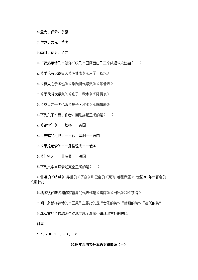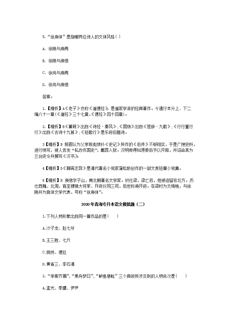 【文档名称】 2020年青海专升本语文模拟题三套(Word版).doc