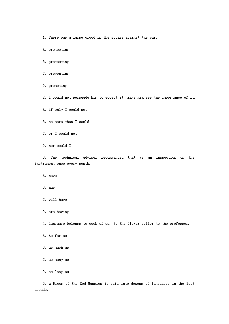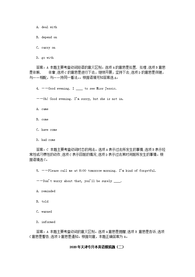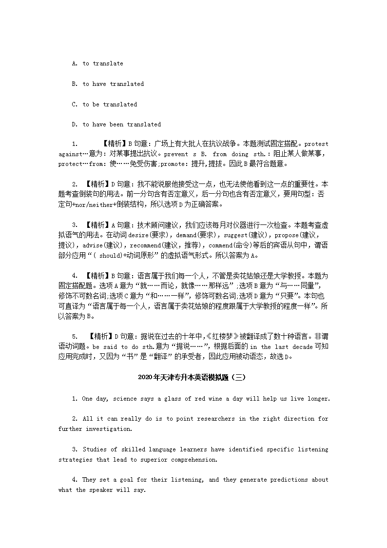 【文档预览】 无忧考网整理发布2020年天津专升本英语模拟题三套(Word版),前五页预览如下: