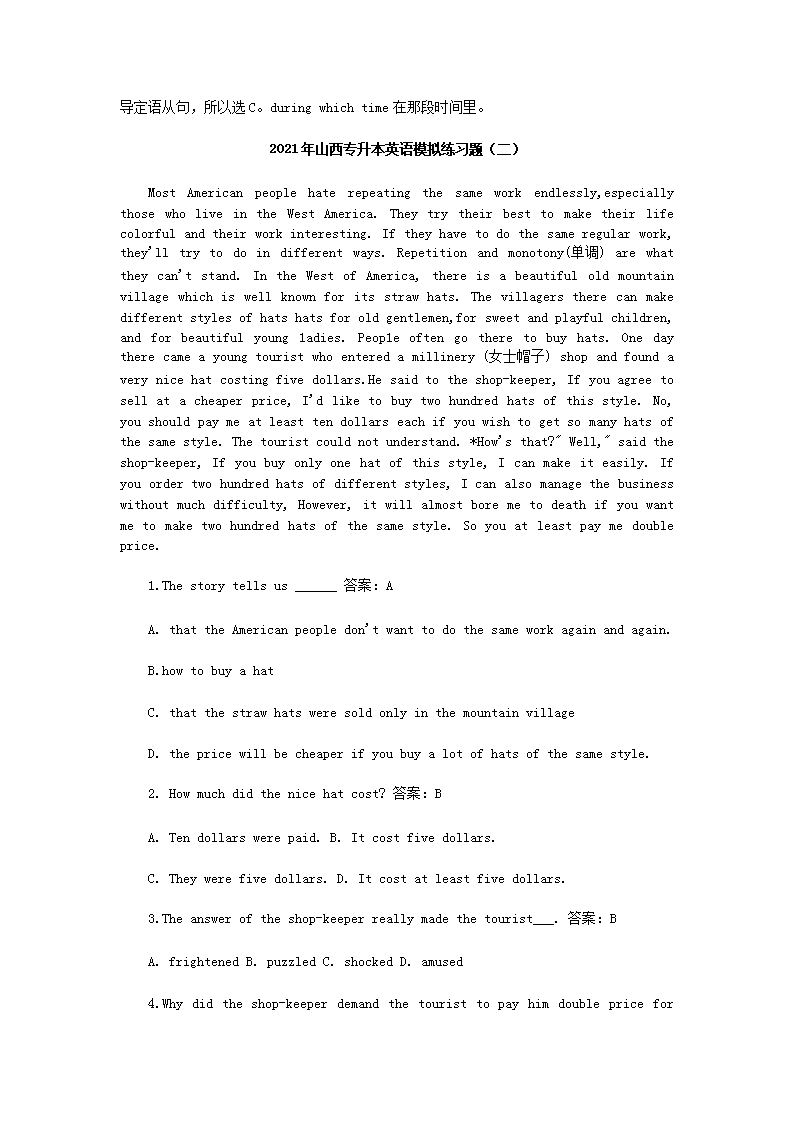 【文档预览】 无忧考网整理发布2021年山西专升本英语模拟练习题三套(Word版),前五页预览如下: