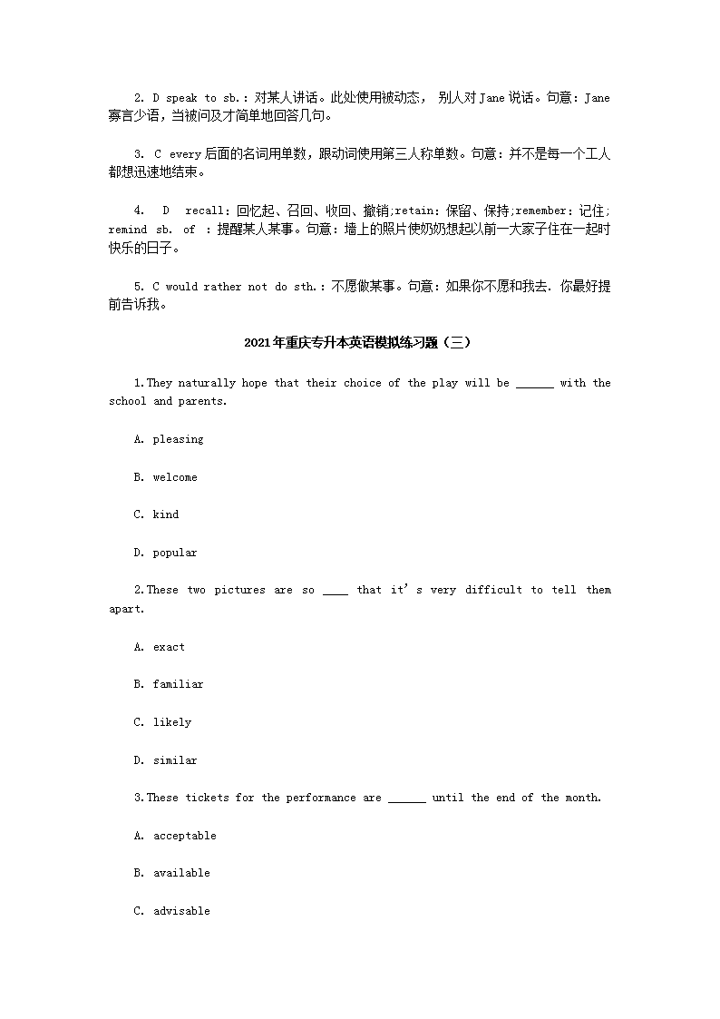 【文档预览】 无忧考网整理发布2021年重庆专升本英语模拟练习题三套(Word版),前五页预览如下: