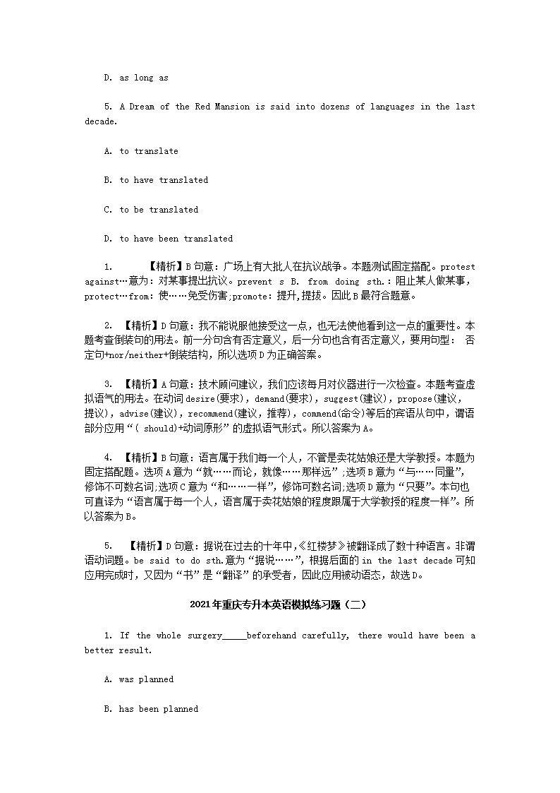 【文档名称】 2021年重庆专升本英语模拟练习题三套(Word版).doc