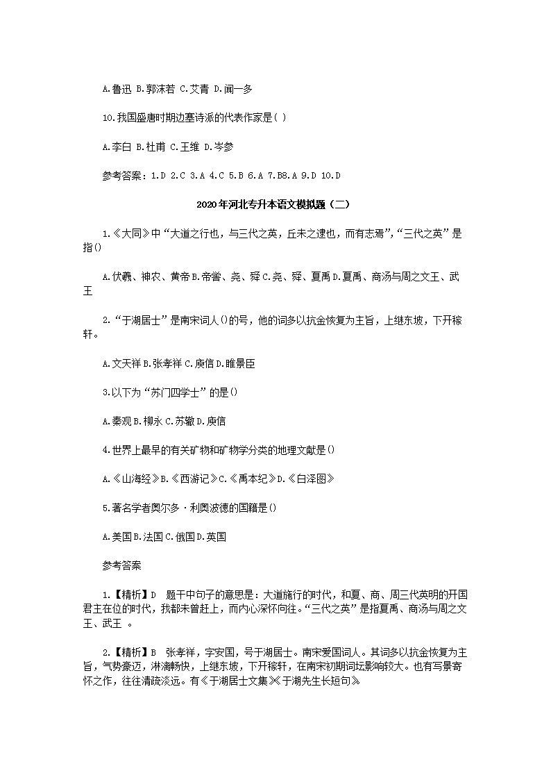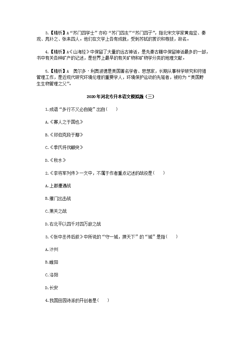 【文档名称】 2020年河北专升本语文模拟题三套(Word版).doc