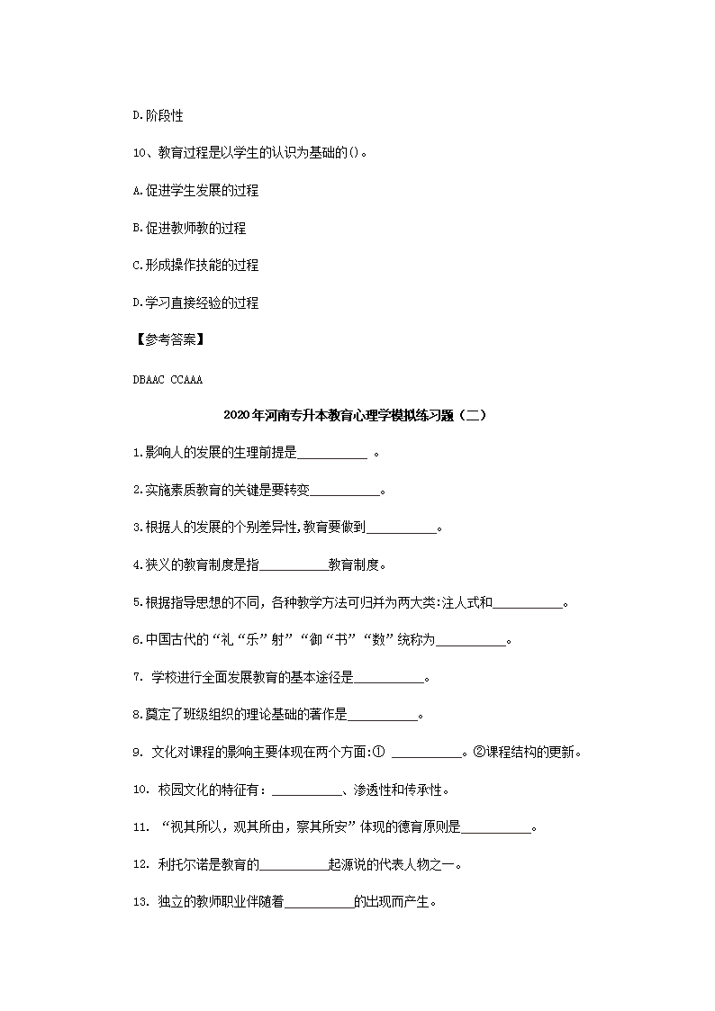【文档名称】 2020年河南专升本教育心理学模拟练习题三套(Word版).doc
