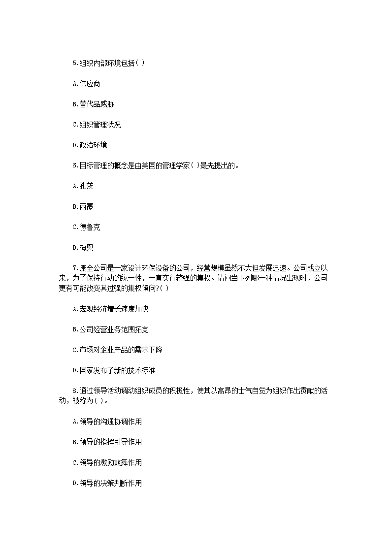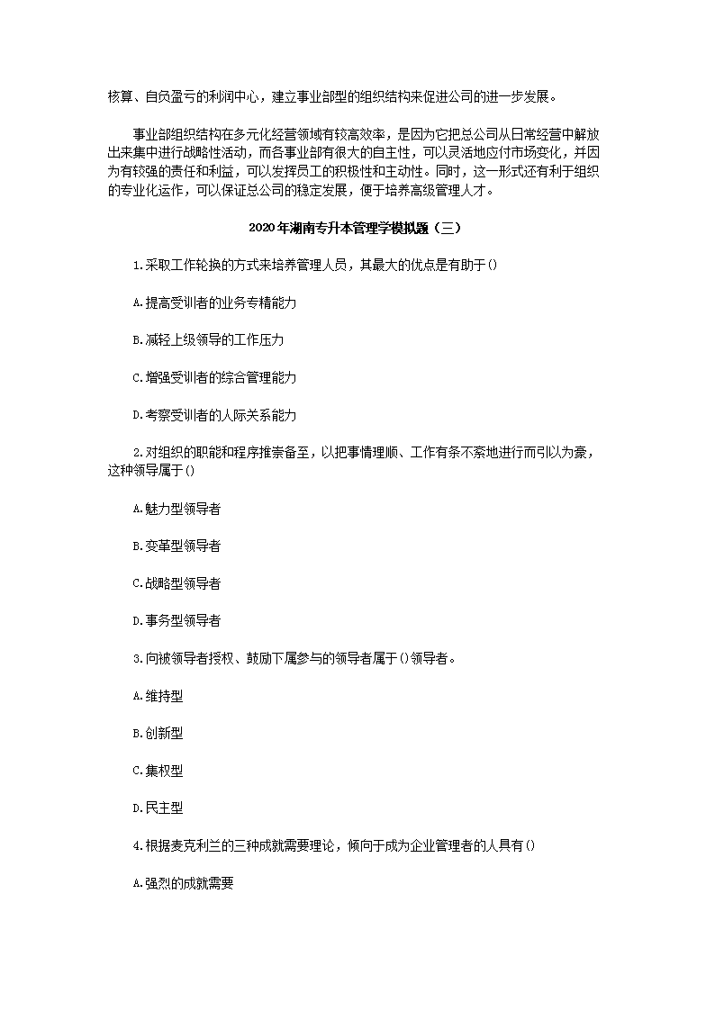 【文档预览】 无忧考网整理发布2020年湖南专升本管理学模拟题三套(Word版),前五页预览如下: