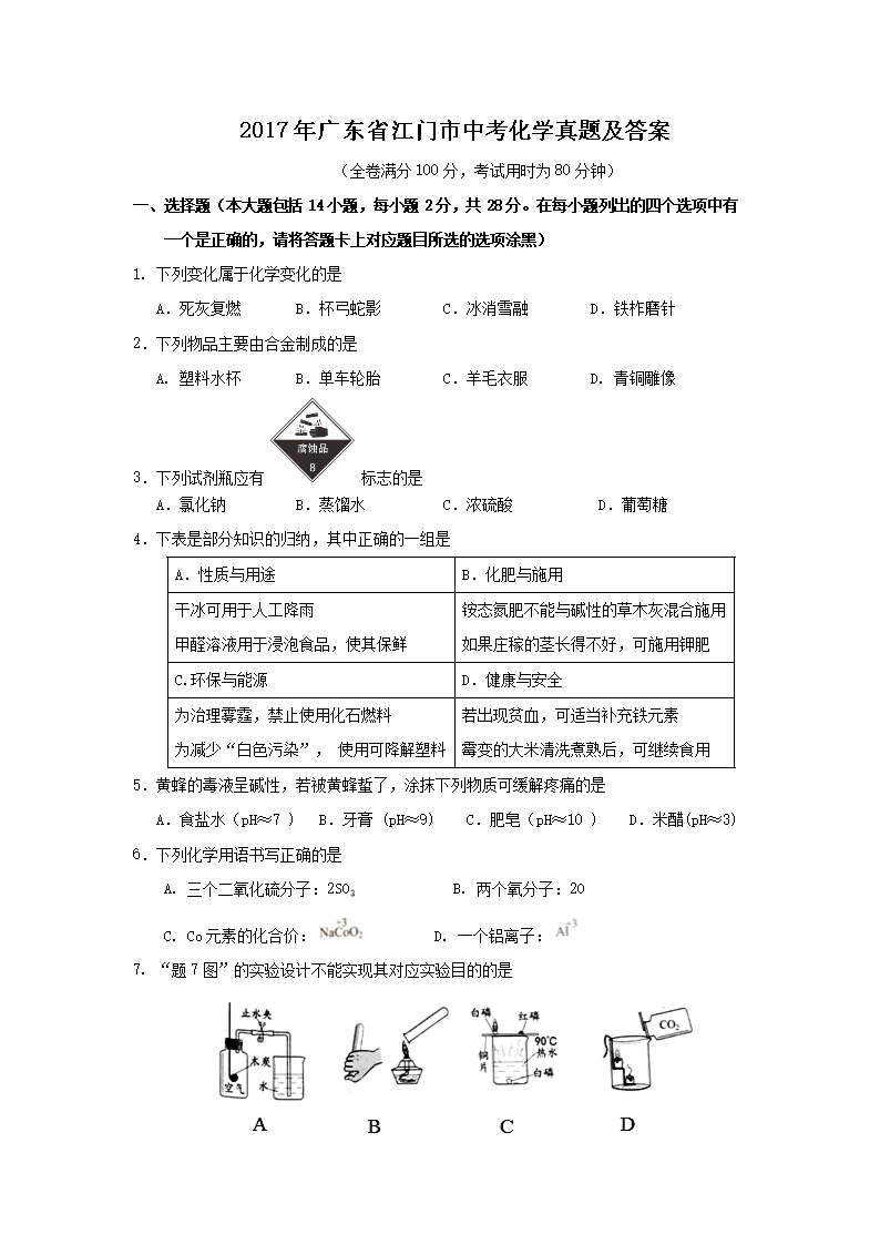 【文档名称】 2017年广东省江门市中考化学真题及答案(Word版).doc