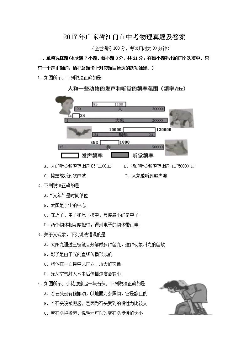 【文档名称】 2017年广东省江门市中考物理真题及答案(Word版).doc