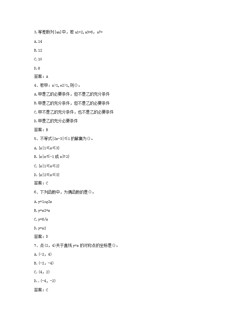 【文档名称】 2016年安徽成人高考高起点数学文真题及答案(Word版).doc