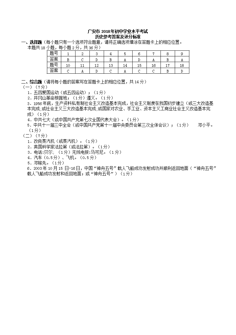 【文档名称】 2018年四川省广安市中考历史真题及答案(Word版).doc
