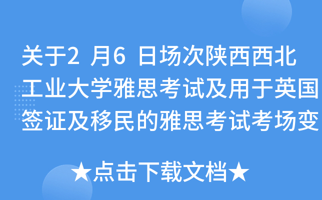 【#雅思考试(IELTS)# #关于2月6日场次陕西西北工业大学雅思考试及用于英国签证及移民的雅思考试考场变更通知#】©无忧考网从教育部考试中心雅思考试报名网获悉,关于2月6日场次陕西西北工业大学雅思考试及用于英国签证及移民的雅思考试考场变更通知已公布,请相关人员仔细阅读,具体详情如下: