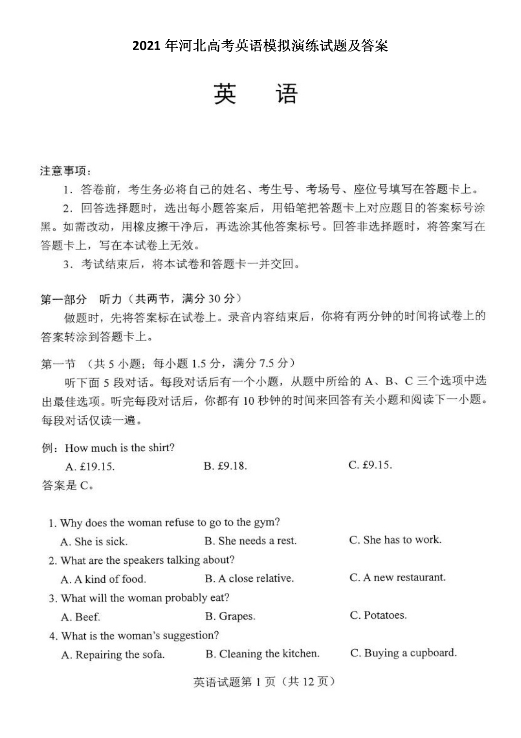 【文档预览】 无忧考网整理发布2021年河北高考英语模拟演练试题及答案(Word版),前五页预览如下: