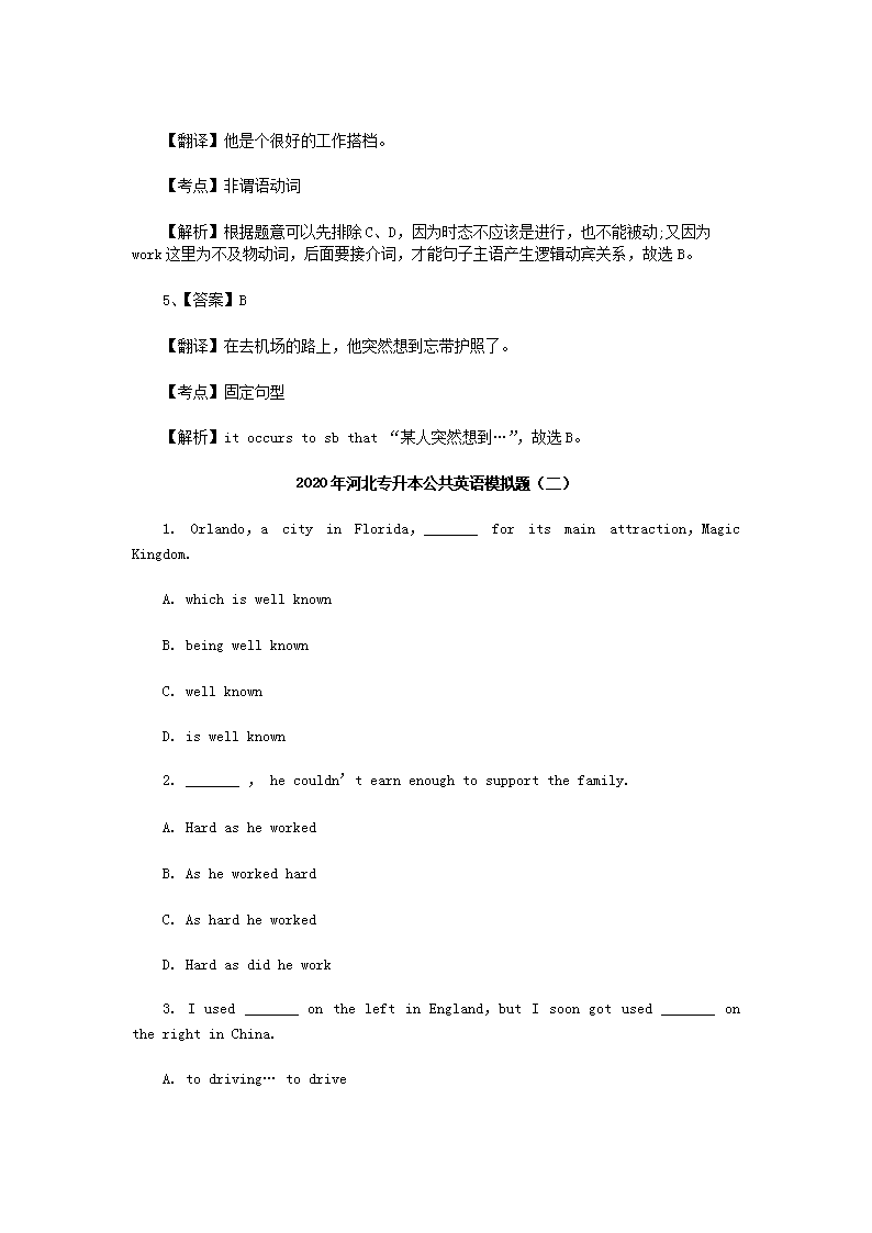 【文档预览】 无忧考网整理发布2020年河北专升本公共英语模拟题三套(Word版),前五页预览如下: