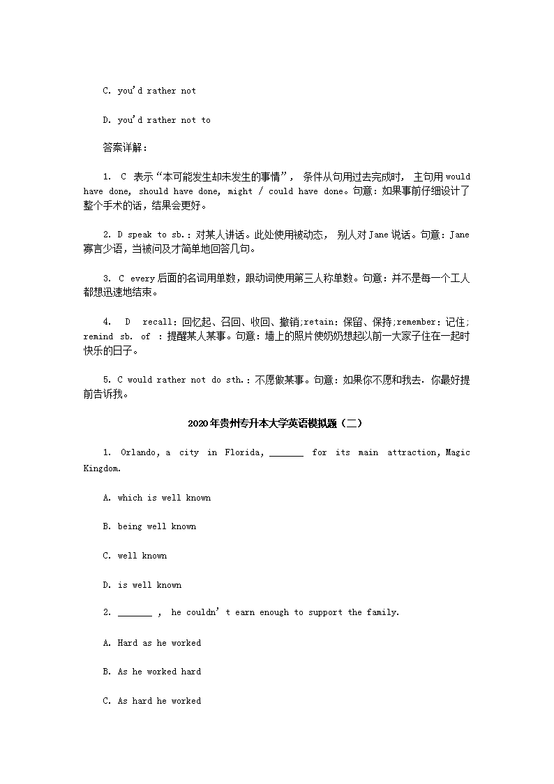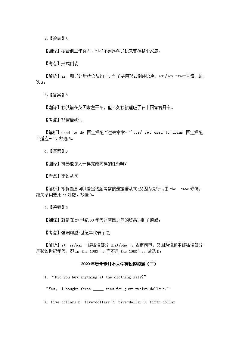 【文档预览】 无忧考网整理发布2020年贵州专升本大学英语模拟题三套(Word版),前五页预览如下: