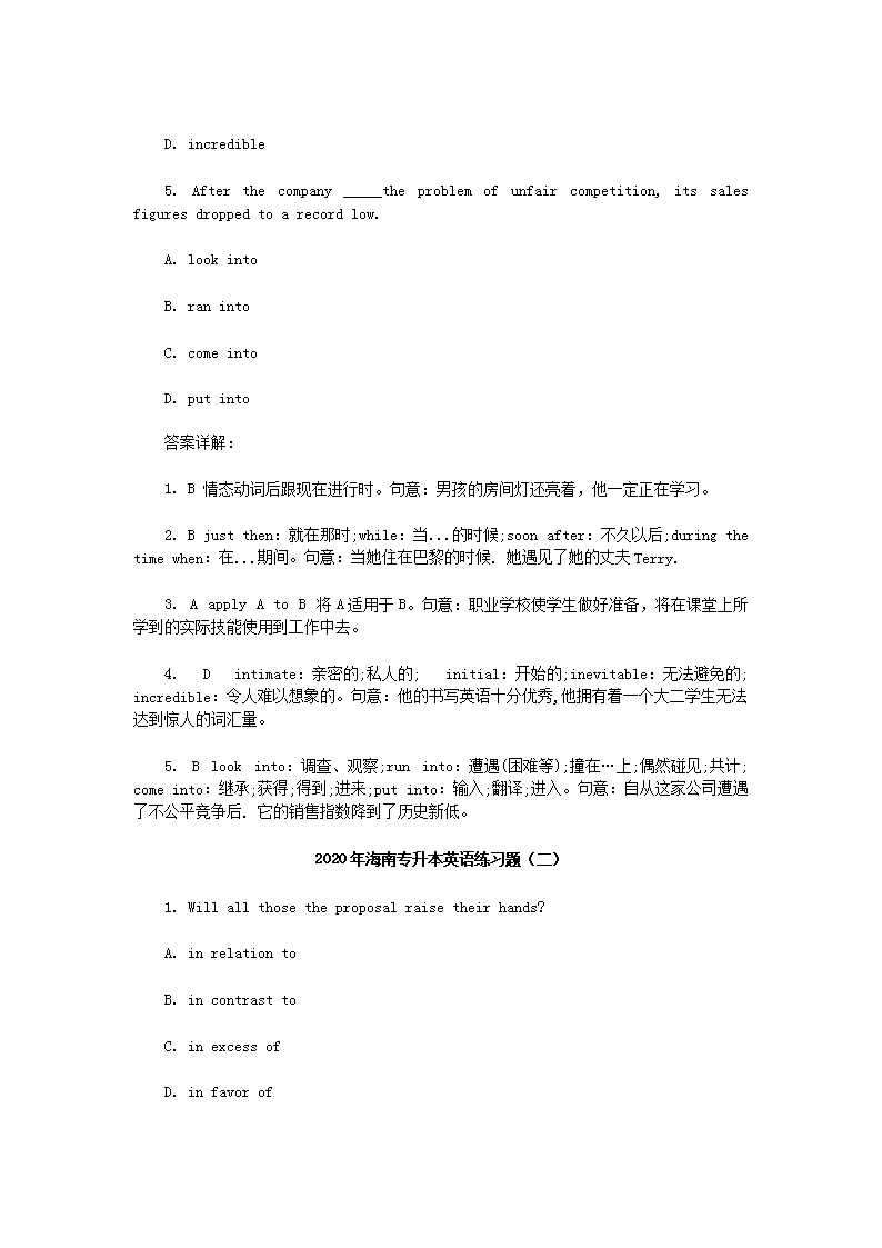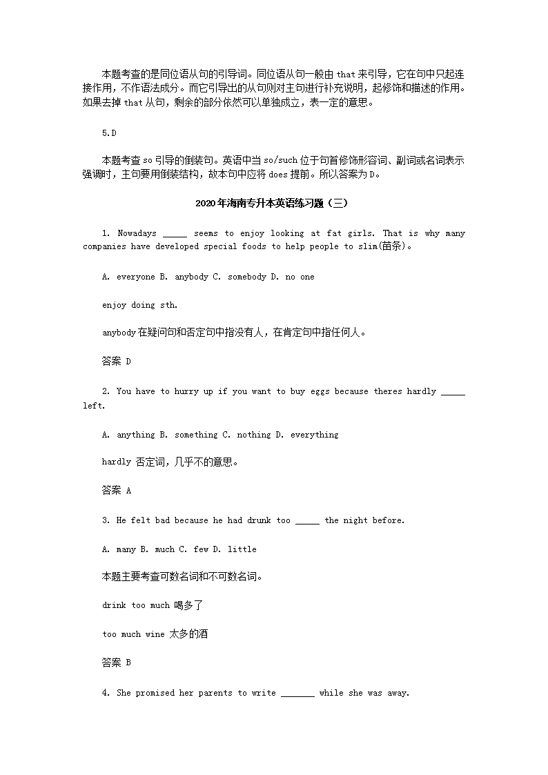 【文档预览】 无忧考网整理发布2020年海南专升本英语练习题三套(Word版),前五页预览如下: