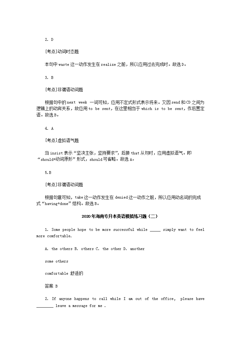 【文档预览】 无忧考网整理发布2020年海南专升本英语模拟练习题三套(Word版),前五页预览如下: