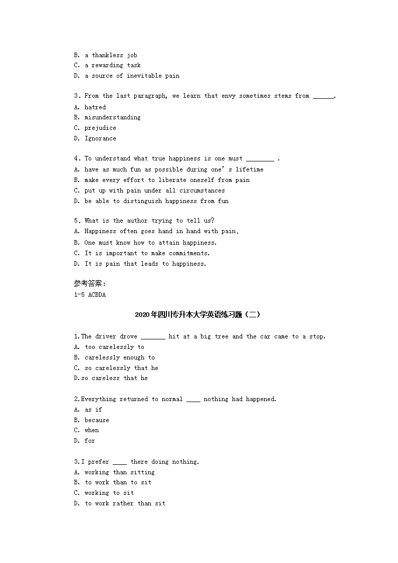 【文档预览】 无忧考网整理发布2020年四川专升本大学英语练习题三套(Word版),前五页预览如下: