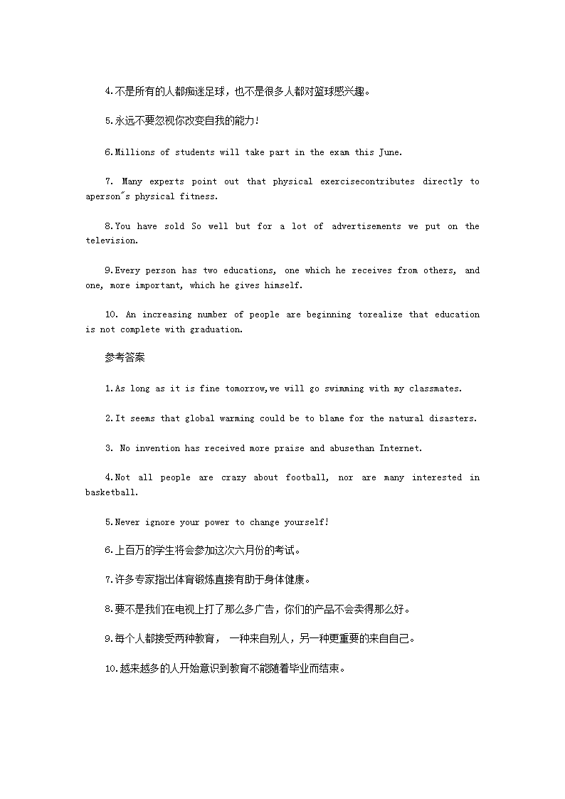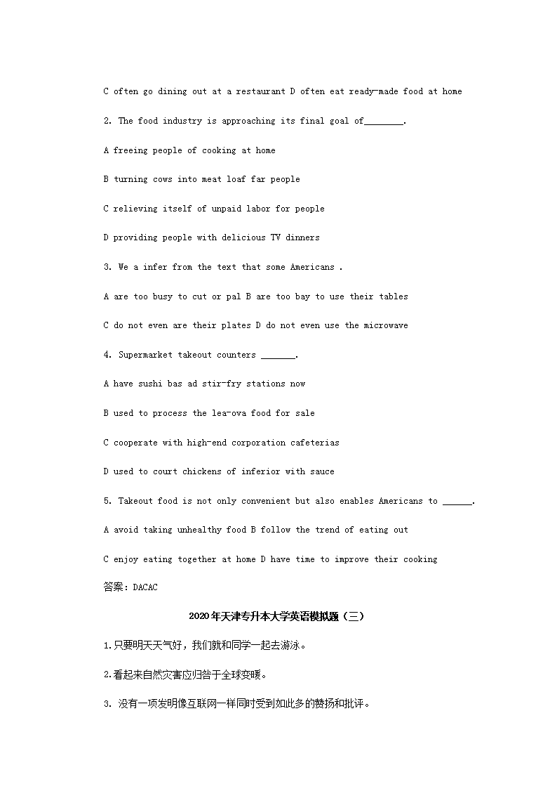 【文档预览】 无忧考网整理发布2020年天津专升本大学英语模拟题三套(Word版),前五页预览如下:
