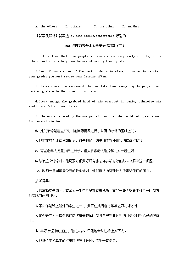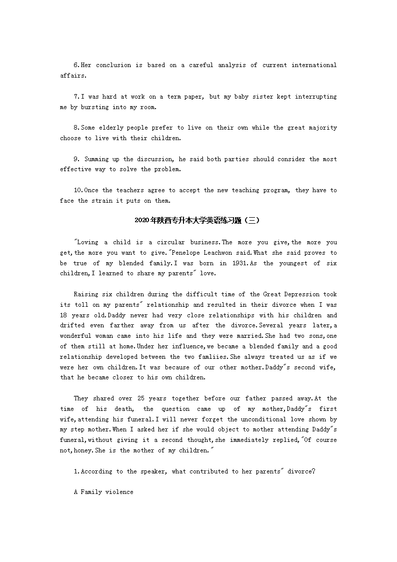【文档预览】 无忧考网整理发布2020年陕西专升本大学英语练习题三套(Word版),前五页预览如下: