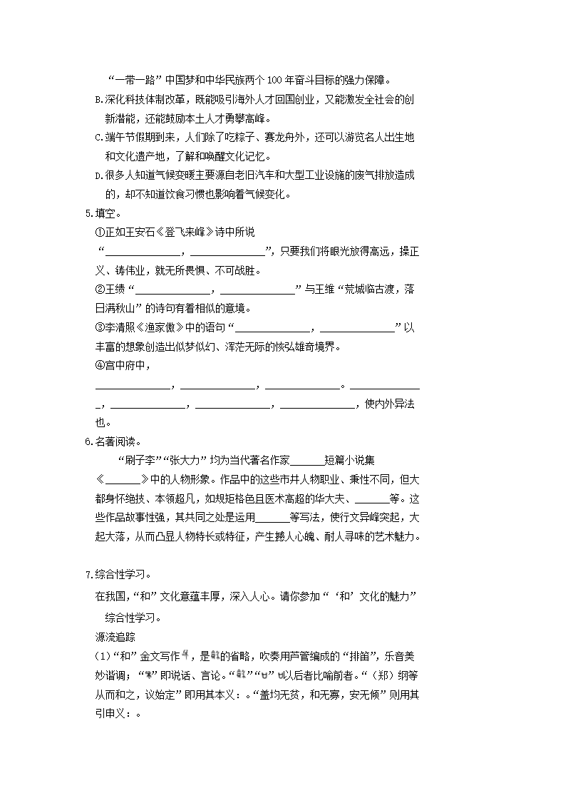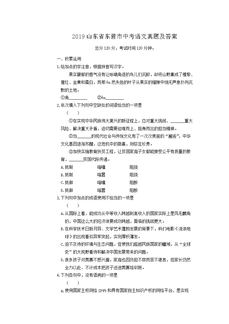 【文档名称】 2019山东省东营市中考语文真题及答案(Word版).doc