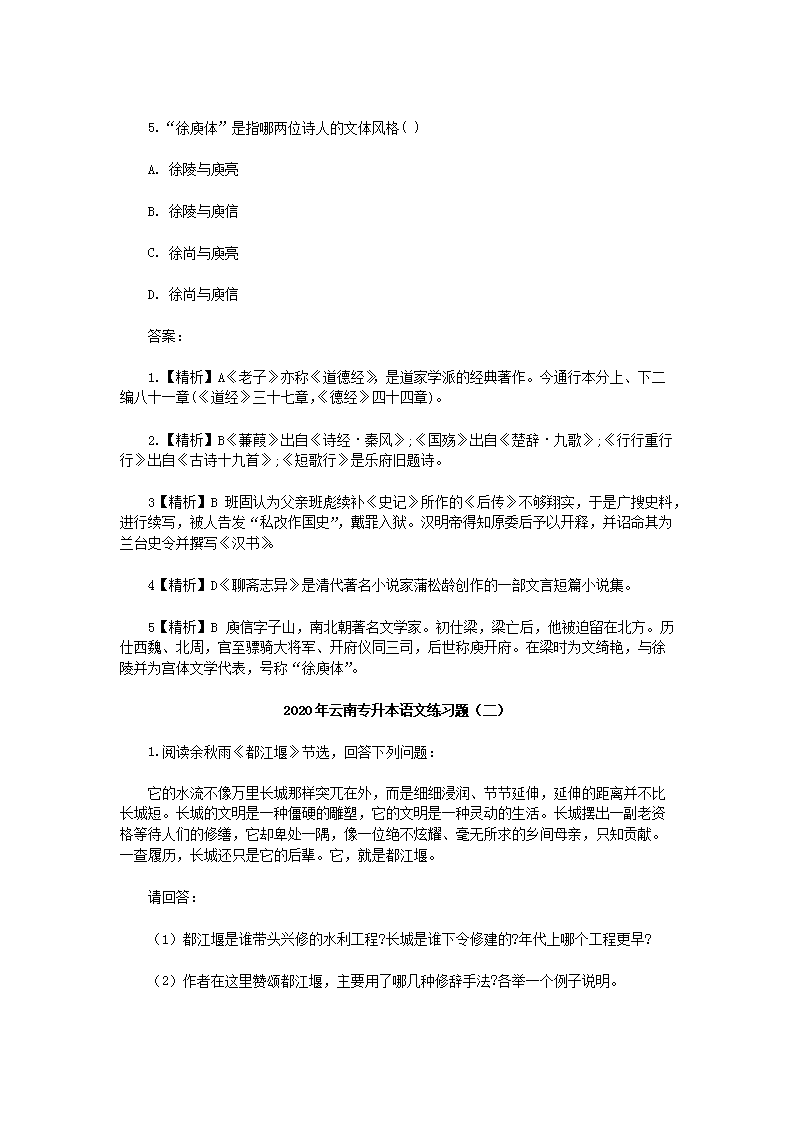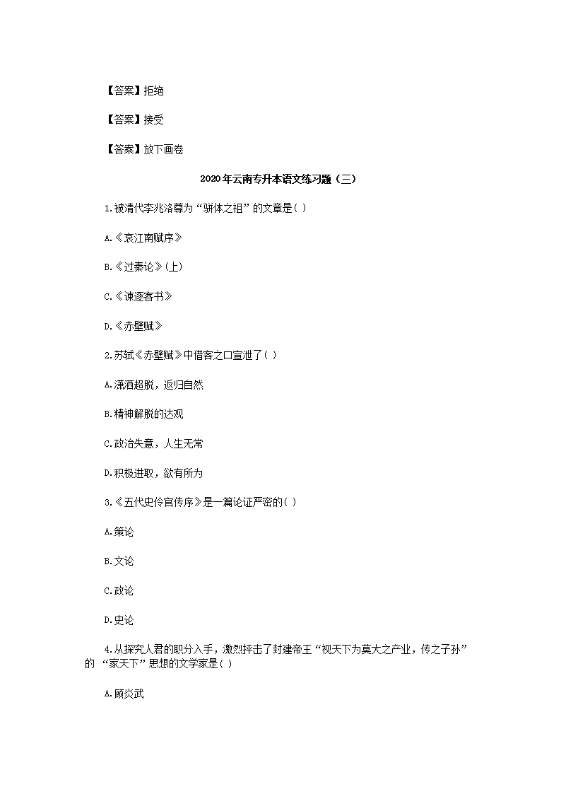 【文档名称】 2020年云南专升本语文练习题三套(Word版).doc