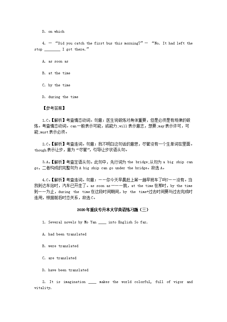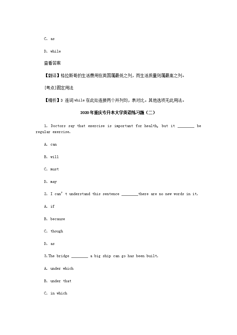 【文档预览】 无忧考网整理发布2020年重庆专升本大学英语练习题三套(Word版),前五页预览如下: