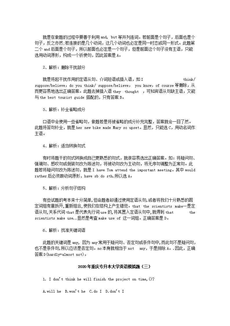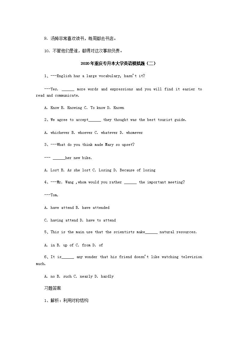 【文档预览】 无忧考网整理发布2020年重庆专升本大学英语模拟题三套(Word版),前五页预览如下: