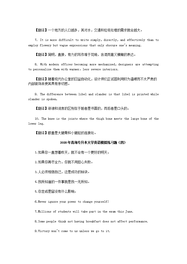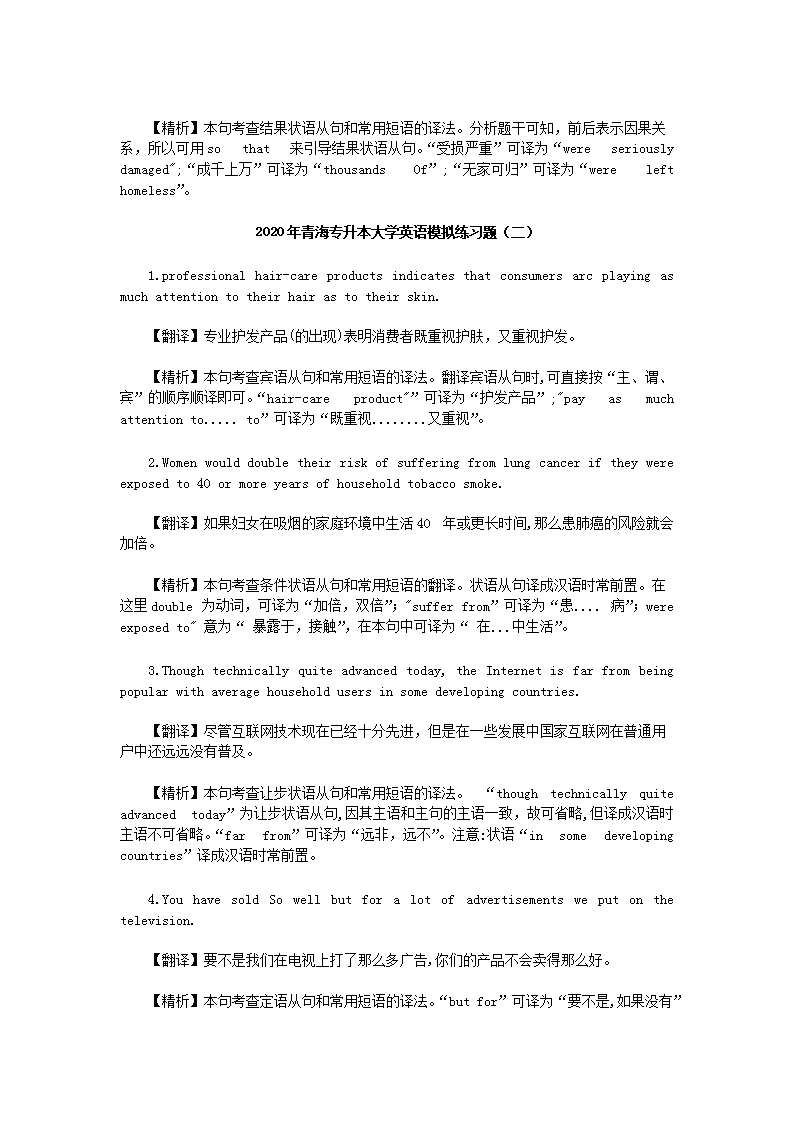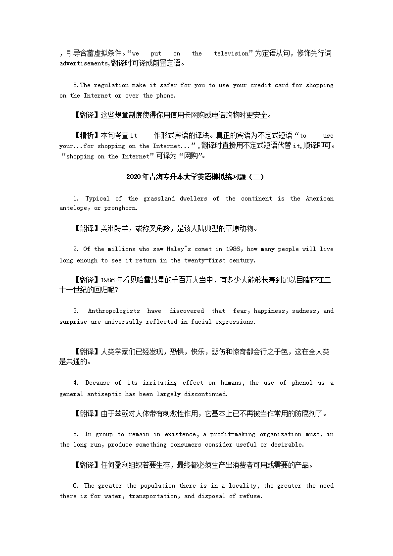 【文档预览】 无忧考网整理发布2020年青海专升本大学英语模拟练习题四套(Word版),前五页预览如下: