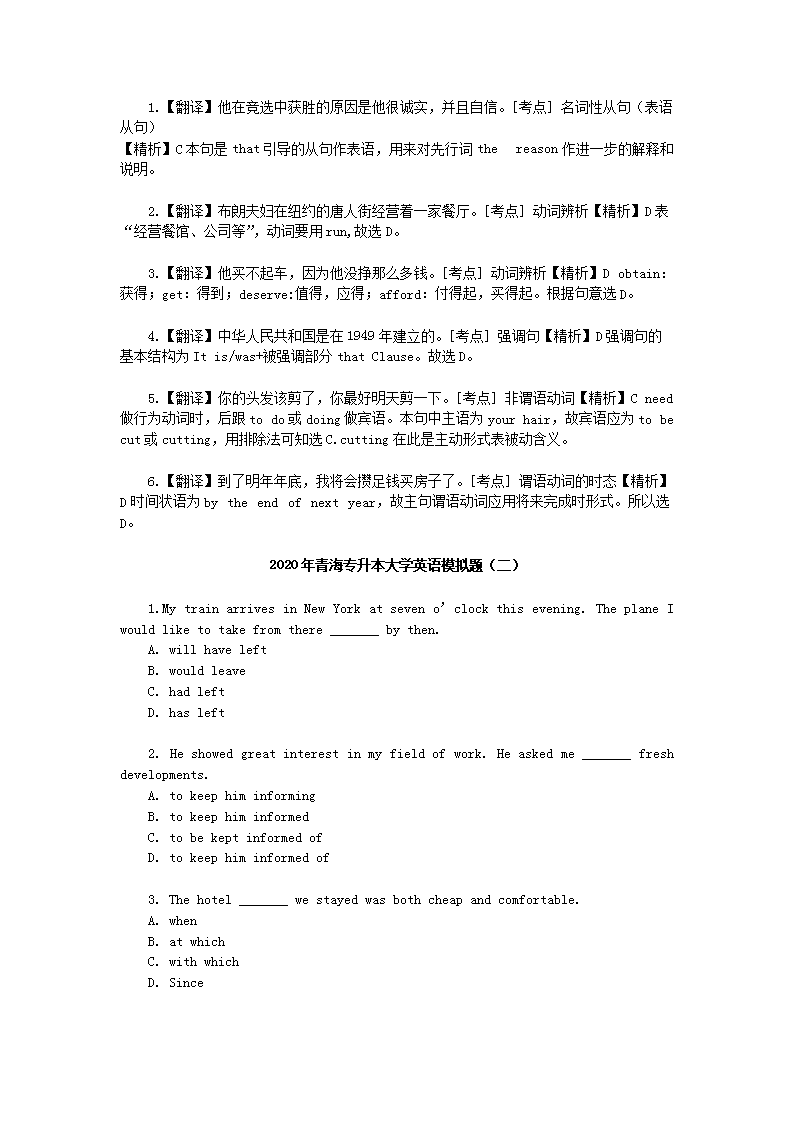 【文档预览】 无忧考网整理发布2020年青海专升本大学英语模拟题三套(Word版),前五页预览如下: