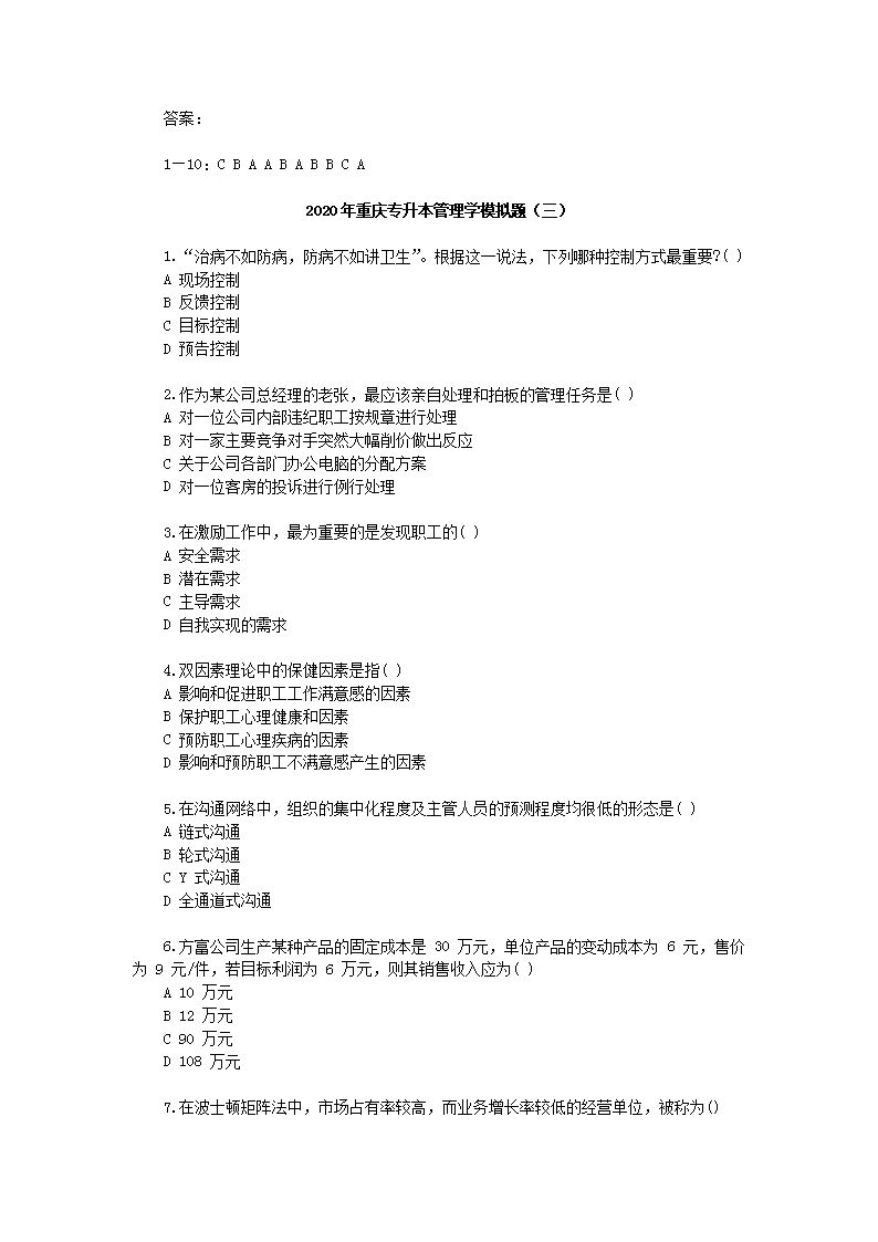 【文档预览】 无忧考网整理发布2020年重庆专升本管理学模拟题三套(Word版),前五页预览如下: