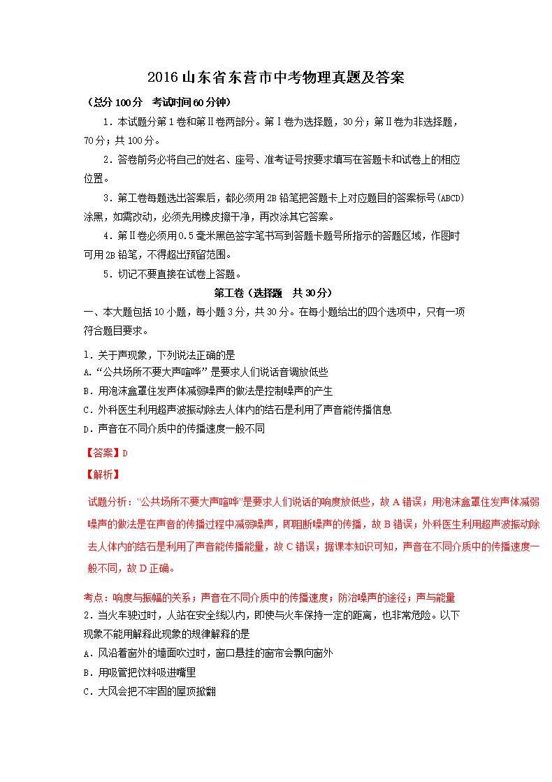 【文档预览】 无忧考网整理发布2016山东省东营市中考物理真题及答案(Word版),前五页预览如下: