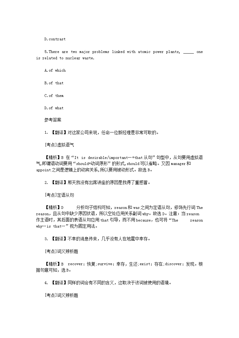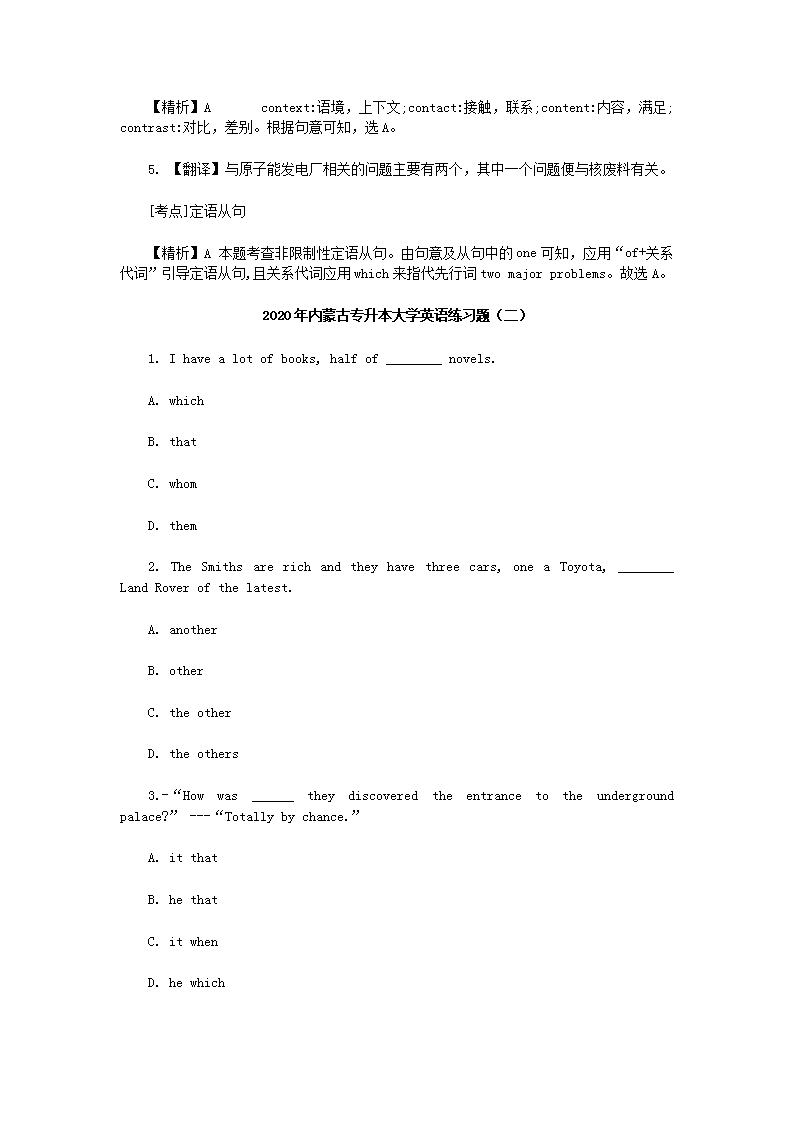 【文档预览】 无忧考网整理发布2020年内蒙古专升本大学英语练习题三套(Word版),前五页预览如下: