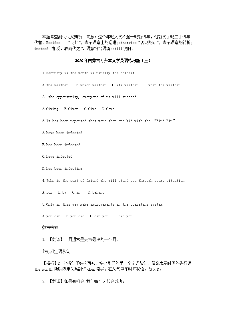 【文档名称】 2020年内蒙古专升本大学英语练习题三套(Word版).doc