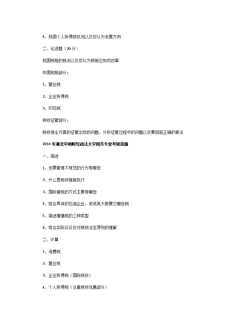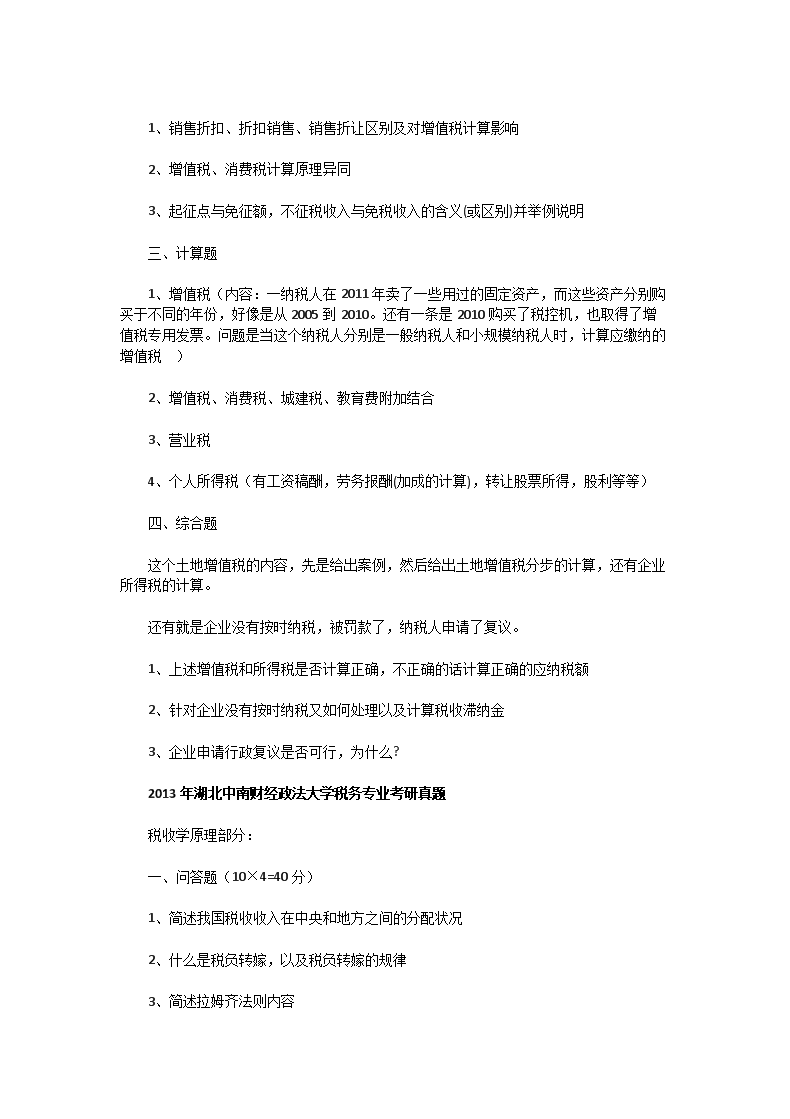 【文档名称】 2011一2014年湖北中南财经政法大学税务专业考研真题(Word版).doc