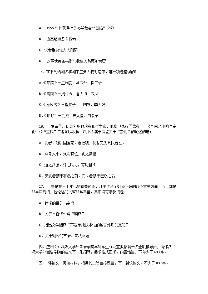 【文档预览】 无忧考网整理发布2017年湖北武汉大学翻译专业考研真题(Word版),前五页预览如下:
