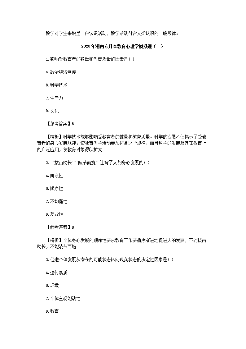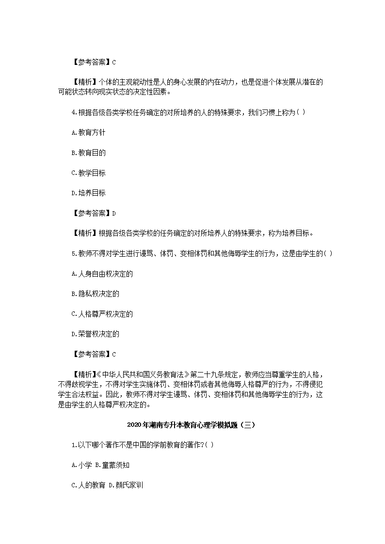 【文档名称】 2020年湖南专升本教育心理学模拟题三套(Word版).doc