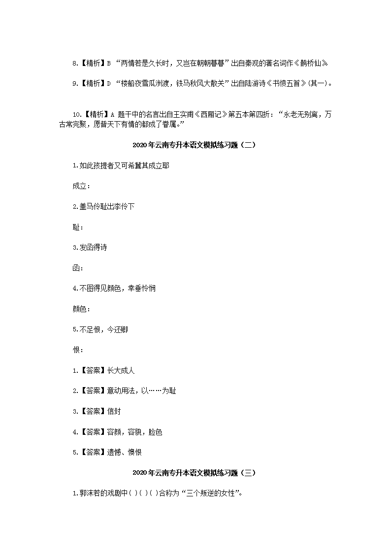 【文档名称】 2020年云南专升本语文模拟练习题三套(Word版).doc