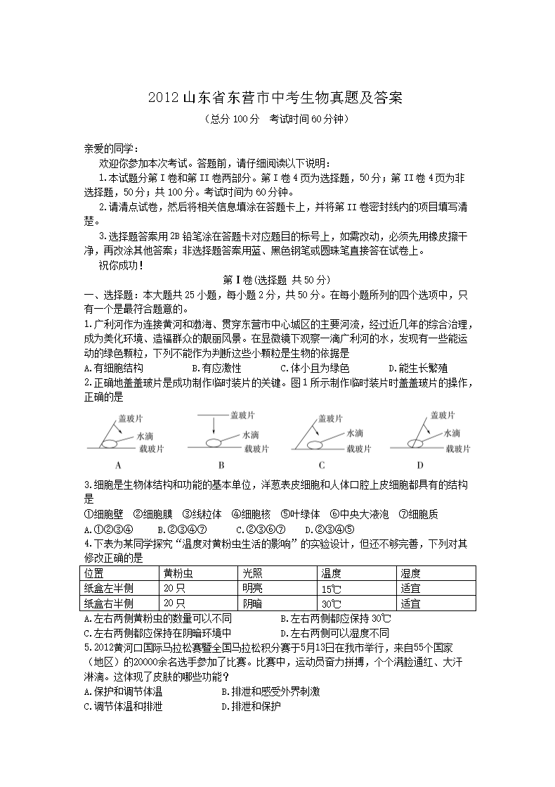 【文档预览】 无忧考网整理发布2012山东省东营市中考生物真题及答案(Word版),前五页预览如下: