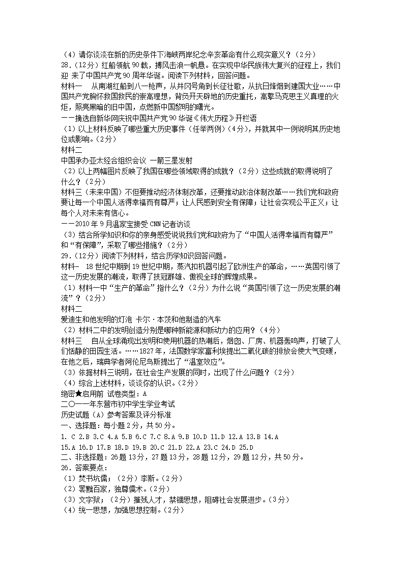【文档名称】 2011山东省东营市中考历史真题及答案(Word版).doc