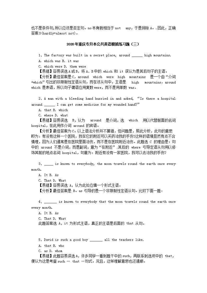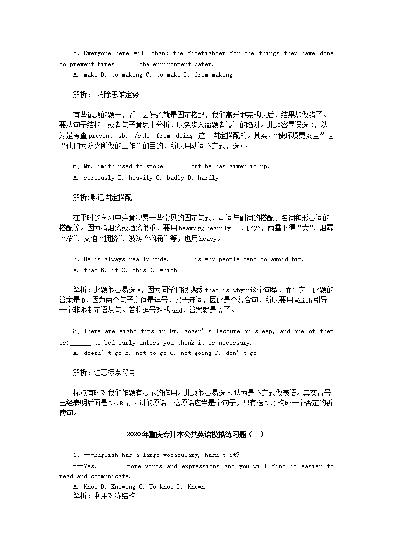 【文档预览】 无忧考网整理发布2020年重庆专升本公共英语模拟练习题三套(Word版),前五页预览如下: