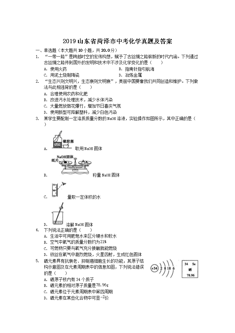 【文档预览】 无忧考网整理发布2019山东省菏泽市中考化学真题及答案(Word版),前五页预览如下: