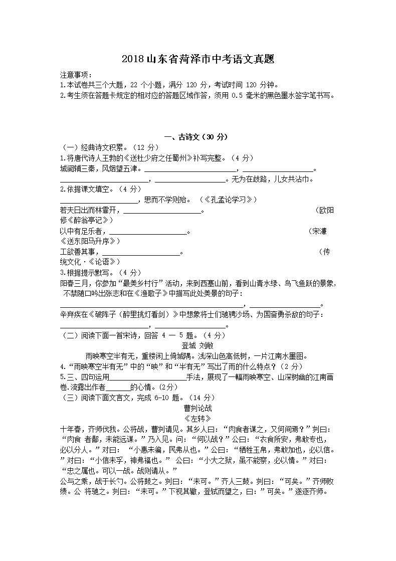 【文档名称】 2018山东省菏泽市中考语文真题(Word版).doc