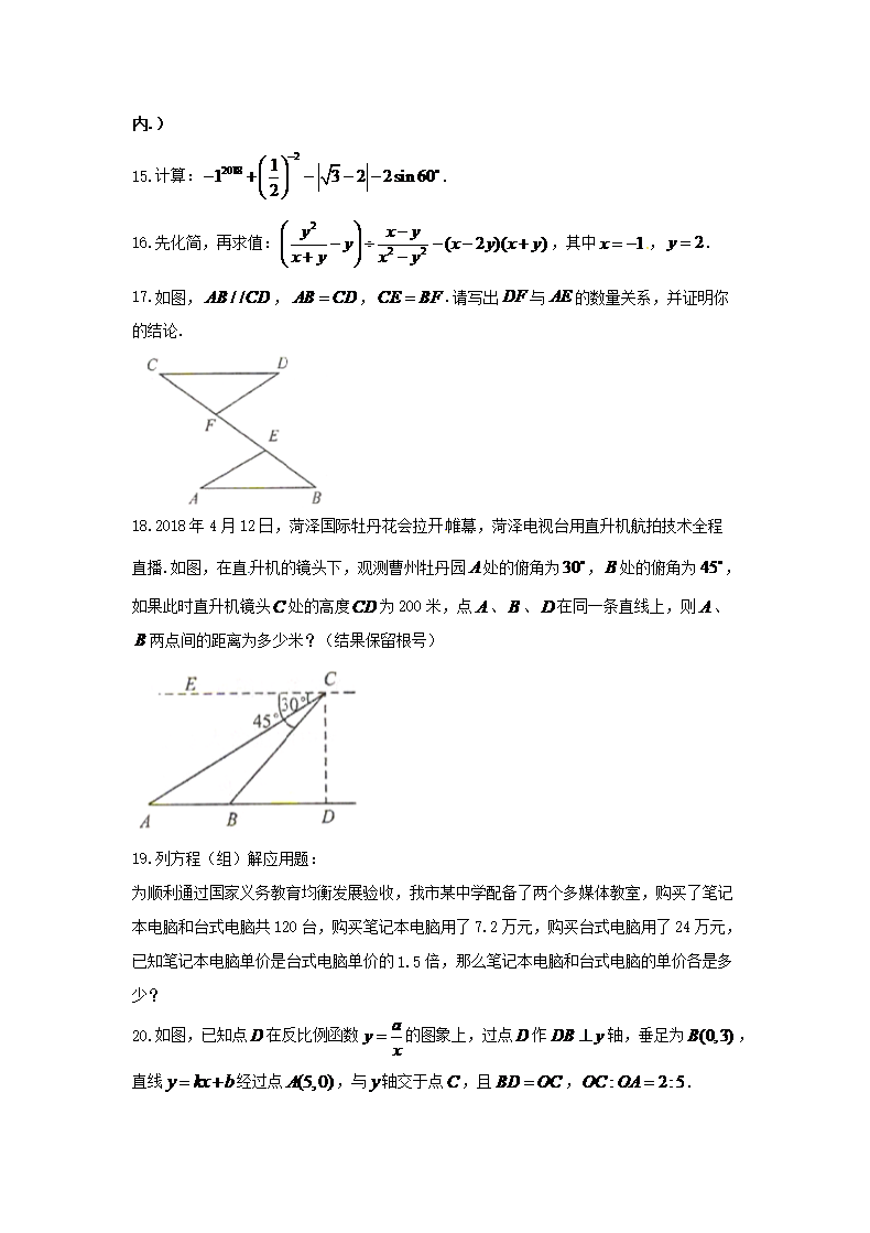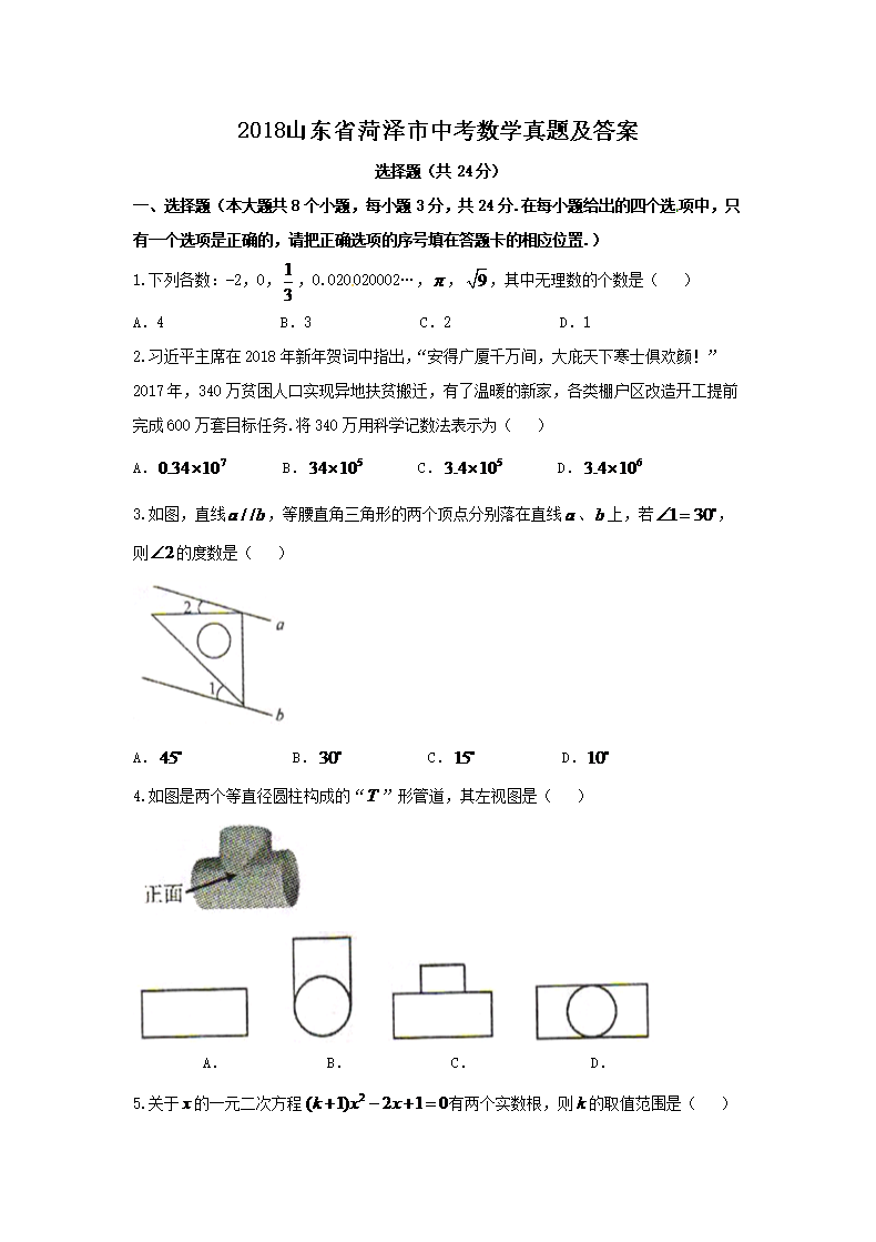 【文档名称】 2018山东省菏泽市中考数学真题及答案(Word版).doc
